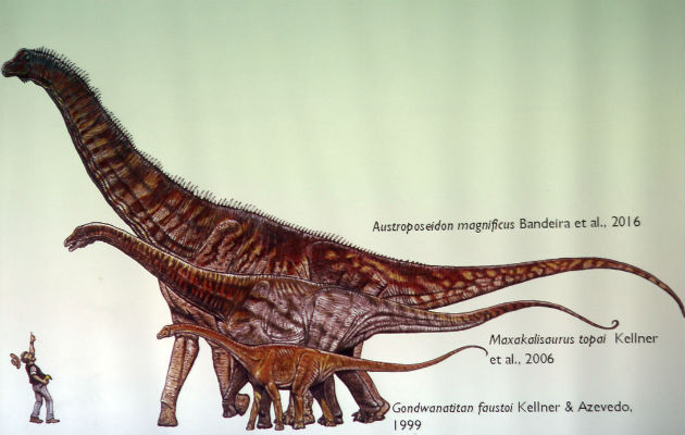 Investigadores brasileños anunciaron el descubrimiento del mayor dinosaurio encontrado en el país, que vivió hace unos 70 millones de años y tenía más de 25 metros de longitud. El animal, bautizado como "Austroposeidon magníficus", pertenecería al grupo de los titanossauros, que eran herbívoros, tenían el cuello y la cola largos y un cráneo relativamente pequeño, y habitaron durante el periodo cretácico en el supercontinente de Gondwana, que aglutinó a las actuales América del Sur, África, India, Antártica y Australia. El "magníficus" desbanca a otro titanossauro, el "Maxakalisaurus topai", que con 13 metros de longitud estaba considerado hasta ahora como el mayor dinosaurio encontrado en Brasil. Los expertos explicaron que el descubrimiento fue posible tras el análisis de un fósil encontrado en una localidad del interior del estado de Sao Paulo en la década de los años 50 por uno de los más reconocidos paleontólogos brasileños, Llewellyn Ivor Price. El fósil permitió reconstruir un brazo del animal a tamaño natural con la ayuda de un tomógrafo que reveló detalles hasta ahora desconocidos sobre esta especie de dinosaurios, como la presencia de un tejido óseo más denso. Durante la presentación, Alex Kellner, paleontólogo de Museo Nacional (UFRJ), lamentó que el descubrimiento haya demorado décadas en ser anunciado por la escasez de fondos destinados a la investigación científica en Brasil. El director del Museo de Ciencias de la Tierra, Diógenes Campos, se mostró convencido de que "la región central de Brasil es riquísima en fósiles y con certeza hay muchos descubrimientos por hacer".