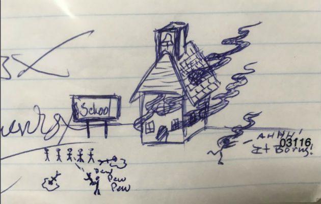 Un dibujo de una escuela en llamas con un hombre disparando contra varias personas fue la escena que apareció en un dibujo hallado en la tarea de uno de los estudiantes, acabó con un hombre detenido.