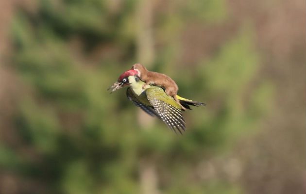 Parece que la historia detrás de la foto del pájaro que lleva a una comadreja bebé sobre él no tiene nada conmovedor tal como lo muestra la foto. El aficionado a la fotografía, Martín Le-May contó que estaba en un parque en Londres cuando vio a los animales.