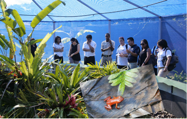 Un centenar de ranas dardo venenosas habitan en un hotel ubicado en las riberas del Canal de Panamá, para que todo el quiera fascinarse con su piel multicolor pueda ver a estos diminutos anfibios cuyo hábitat natural está amenazado por la acción del hombre. La exhibición permanente "Tierra de Ranas", muestra 3 géneros de este anfibio de la familia anuros, que son endémicas de Centro y Suramérica, en un espacio que simula su hábitat natural.En el jardín de ranas se encuentran géneros como "Dendrobates" de color negro y verde; la "oophaga", que posee más de 20 combinaciones de colores, y la "phillobates". Módulos de vidrio y alrededor de 25 plantas de la cuenca del Canal de Panamá sirven de asiento natural para los anfibios, siendo la planta bromelia una de las más importantes por su particularidad de acumular agua en las hojas. Las ranas dardo pueden vivir 10 años en cautiverio. Las hembras desovan en la hojarasca o el sustrato del suelo, hasta llegar a reproducir una docena de huevos, que una vez eclosionados a renacuajo, son llevados en su espalda por el macho a una bromelia para que allí terminen su ciclo. Entre las hojas y ramas del jardín instalado en el hotel se pueden apreciar las ranas dardo, que "se caracterizan por su minúsculo tamaño y su piel colorida que contiene alcaloides tóxicos que advierte a los depredadores que tienen veneno o mal sabor", dijo a Efe José Soto, director de Actividades del Hotel Gamboa Rainforest. El centenar de ranas dardo que se encuentra en exhibición, sin embargo, no poseen la enzima de defensa debido a la alimentación que reciben, a base de frutas en descomposición. Las ranas dardo silvestres producen las toxinas de los insectos, hormigas y ciertos escarabajos de los que se alimentan y que, a su vez, la obtienen de las plantas. De cualquier manera, "las posibilidades de morir por una rana venenosas son mínimas, y solo hay dos formas: una que te la comas y dos que la manipules y el veneno entre por una herida abierta", aclaró Soto. El ejecutivo destacó que las ranas dardo se encuentran más amenazas por la devastación de su hábitat a causa de la acción del hombre que por peligros naturales como el hongo quítrico, que está acabando con ranas en todo el mundo. "Las ranas arborícolas son más afectadas por el Batrachochytrium dendrobatidis, conocido como hongo quítrido, que está acabando con éstos anfibios en todo el mundo, el cual no es el caso de las ranas venenosas por ser muy resistentes a los hongos", dijo Soto. El mortal hongo quítrido es el responsable de desaparición paulatina de la diminuta rana dorada, un animal simbólico para los panameños desde tiempos precolombinos. Muchas de las personas que han visitado el recinto nunca han visto una rana venenosa y se sorprenden o desesperan por encontrarlas, lo que guarda su concepto de sentirse en un bosque natural con las mismas condiciones, una de ellas es que las ranas se esconden. Para Romina Tejada, una de las visitante de la exposición, destacó a Efe "el microclima que le han armado" a las ranas. El jardín de ranas recreado en el hotel involucró un trabajo de seis meses para formar un hábitat para que las plantas maduraran, se lograran adaptar, y que el recinto estuviera adecuado para la llegada de las primeras 30 ranitas, indicó Soto. El recinto cuenta con un sistemas de aspersión cada hora y media por cinco minutos, lo cual simula un bajareque que ayuda a mantener una humedad del suelo. En la construcción se tuvo en cuenta la creación de una acera perimetral con espacio suficiente para visitantes con silla de ruedas y la altura de la cerca fue elaborada para la estatura de los niños de 3 años en adelante. El proyecto cuenta con la asesoría de Sergio Bustamente, especialista en cría de ranas dardos en Panamá y donante de los géneros en exhibición.