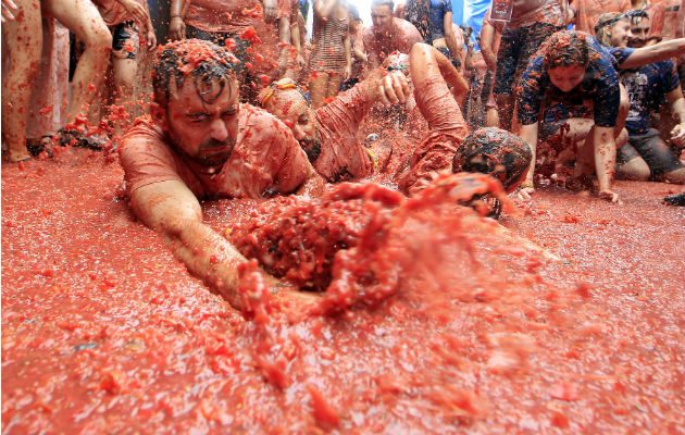 Más de 20.000 personas participaron en la anual Tomatina, una fiesta en las calles de un pueblo en el este de España donde los asistentes se arrojan toneladas de tomates maduros hasta terminar bañados en pulpa roja.