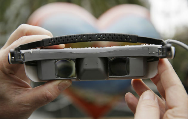 Los visores de eSight transmiten imágenes desde una cámara frontal hacia pequeñas pantallas internas — una para cada ojo — en una forma que envía el video hacia la visión periférica de quien los porta.