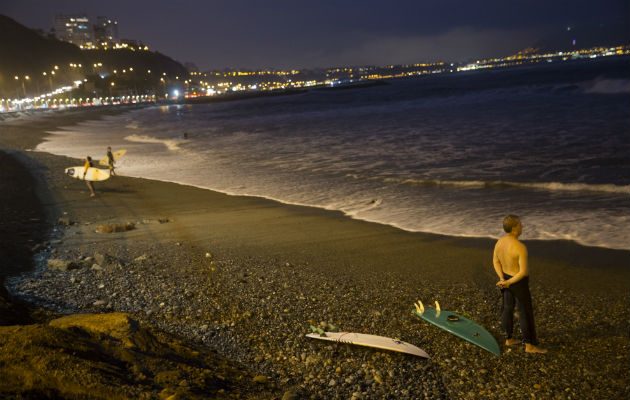 Cuando los casi 10 millones de habitantes de Lima se alistan para dormir, un puñado de surfistas baja hasta la única playa de Perú donde se puede correr olas por la noche.