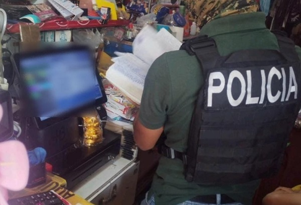 Policía revisa el material encontrado en un comercio, donde se detuvo a un comerciante relacionado con este hecho. Foto: Cortesía Policía Nacional