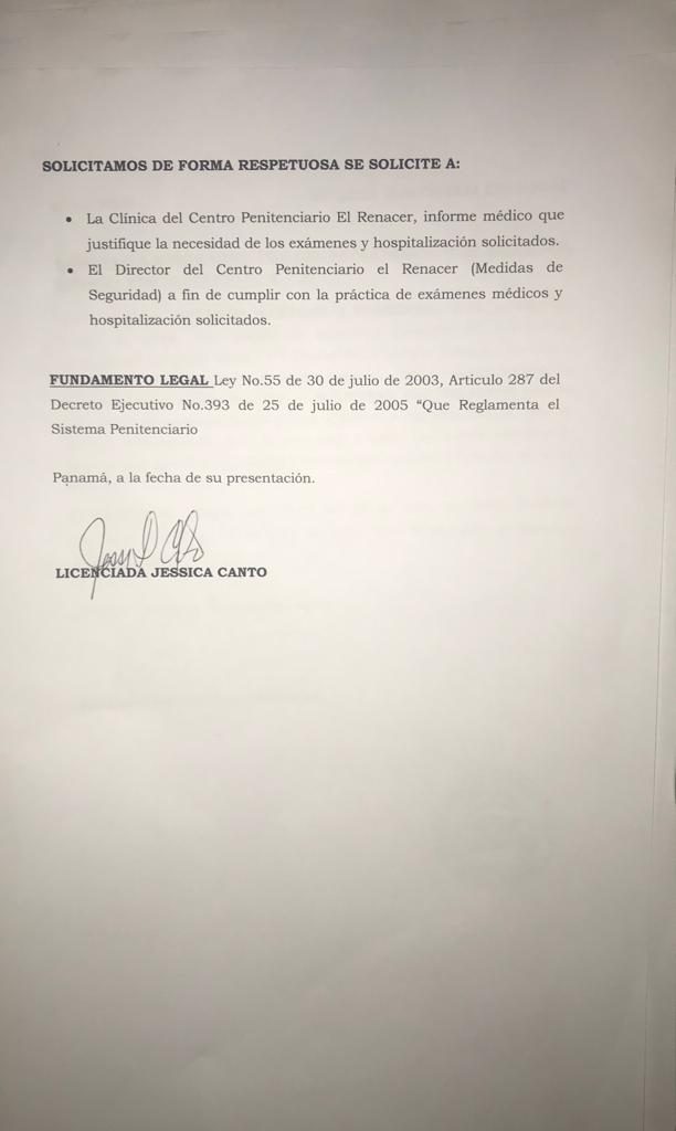 "A continuación adjuntamos los requisitos que la Ley No.55 de 30 de julio de 2003, reglamentada por el Decreto Ejecutivo No.393 de 25 de julio de 2005 que establece en su artículo No.287, requisitos que se solicitan cuando se trata de hospitalización en un hospital privado", indicó Canto a la Dirección General del Sistema Penitenciario.