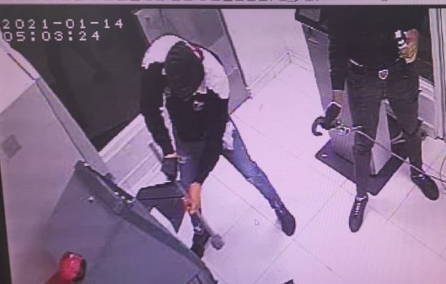 Una fotografía del video de una cámara de vigilancia muestra a dos malhechores. Uno de los asaltantes le pega con un mazo al cajero automático, mientras que otro espera con un gancho.