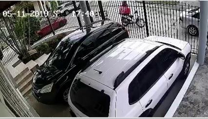 Antes de que el motorizado caminara hacia la entrada de la cerca de hierro, ya había un automóvil de color rojo vino estacionado en una de las esquinas de la casa. El carro solo tenía unos segundos de haberse estacionado.