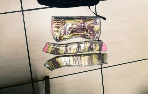 Los dos sujetos, nacionalizados en Estados Unidos, mantenían en su poder una maleta con doble fondo, la misma contenía seis envoltorios en forma de tira y dos paquetes de esta droga.