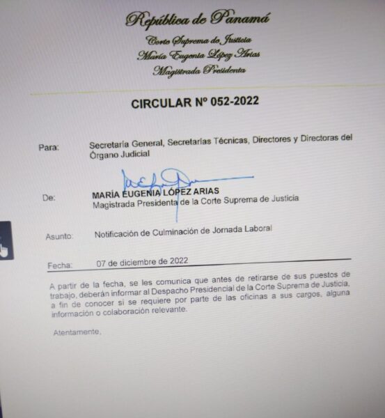 La circular textualmente indica que «A partir de la fecha, se les comunica que antes de retirarse de sus puestos de trabajo, deberán informar al Despacho Presidencial de la Corte Suprema de Justicia».