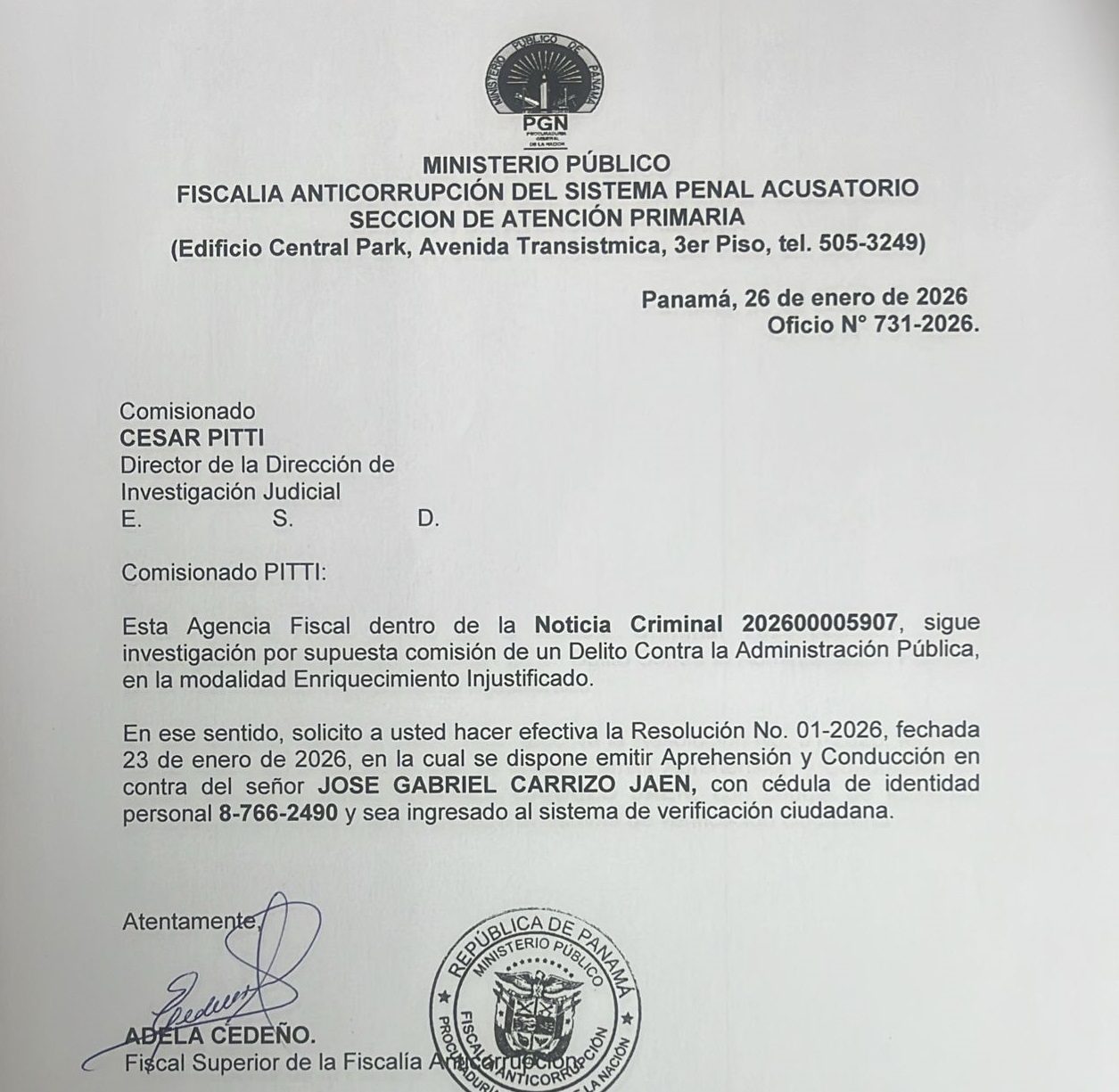 En ese sentido la fiscal Cedeño pidió al Comisionado César Pitti, jefe de la Dirección Judicial, hacer "hacer efectiva la Resolución No. 01-2026, fechada 23 de enero de 2026" para que Carrizo "sea ingresado al sistema de verificación ciudadana".