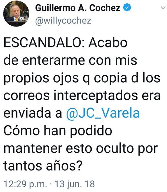 ESCANDALO: Acabo de enterarme con mis propios ojos q copia d los correos interceptados era enviada a @JC_Varela Cómo han podido mantener esto oculto por tantos años?