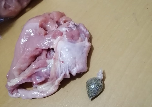 Una mujer y un hombre intentaron ingresar a diferentes centros penitenciarios del país unas pechugas de pollo, que en su interior tenían bolsita de hierba seca, que se presume sea marihuana, y jabones con hojas de "feeling".