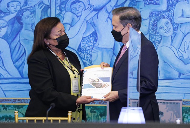 El mandatario Laurentino Cortizo recibió el informe de manos de la representante de la Asociación Panameña de Magistrados y Jueces, Ruby de Ibarra. Foto: Cortesía Presidencia