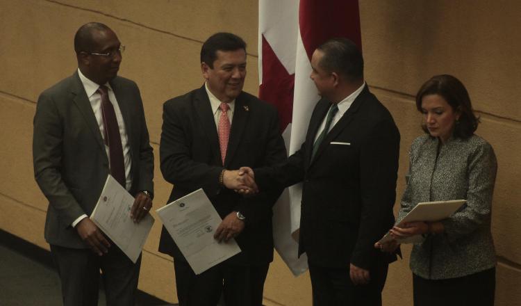 El presidente de la Asamblea Nacional, Marcos Castillero, saluda a Eduardo Ulloa, luego de ser ratificado como procurador general de la nación. Observa Jorge Caraballo. Foto de Víctor Arosemena