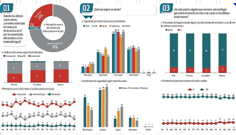 En octubre, 74% de los entrevistados señaló que la inseguridad ha aumentado, en tanto 24% afirmó que se mantiene igual, y 2% manifestó que ha disminuido.