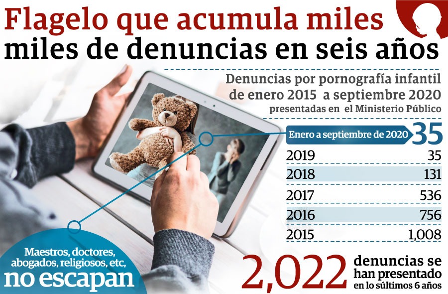 De acuerdo con estadísticas del Ministerio Público, de enero de 2015 a septiembre de 2020, se han registrado un total de 2,022 denuncias por el delito de pornografía infantil.