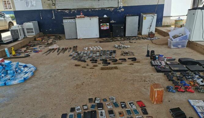 El Ministerio de Gobierno (Mingob), mediante un comunicado, informó que también se decomisaron siete armas de fuego y seis cargadores, 200 municiones, múltiples celulares, sustancias que se presume sean marihuana y cocaína, chips de celulares y platinas.