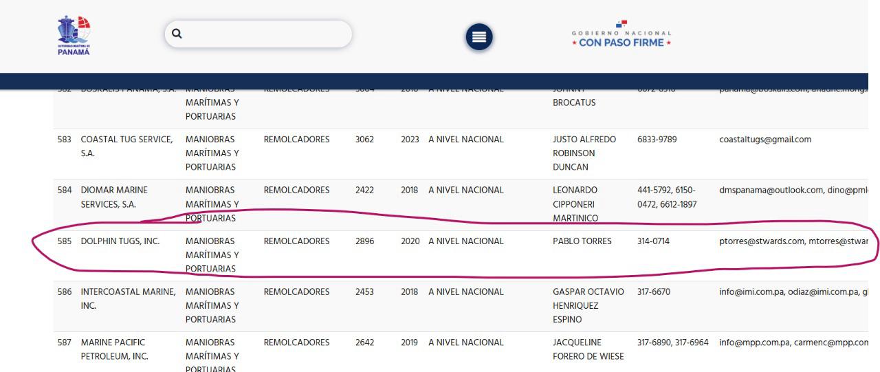 Además, en el listado de las empresas con licencia de operación vigentes de la Autoridad Marítima de Panamá (AMP), actualizado al 30 de octubre de 2025, Pablo Torres figura como el representante legal de la empresa Dolphin Tugs Inc.