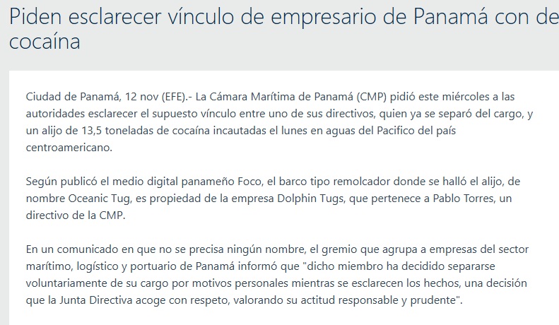 Ayer, la agencia de noticias EFE reportó el hecho expuesto por medios nacionales, incluyendo en sus líneas que "el barco tipo remolcador donde se halló el alijo, de nombre Oceanic Tug, es propiedad de la empresa Dolphin Tugs, que pertenece a Pablo Torres, un directivo de la Cámara Marítima de Panamá".