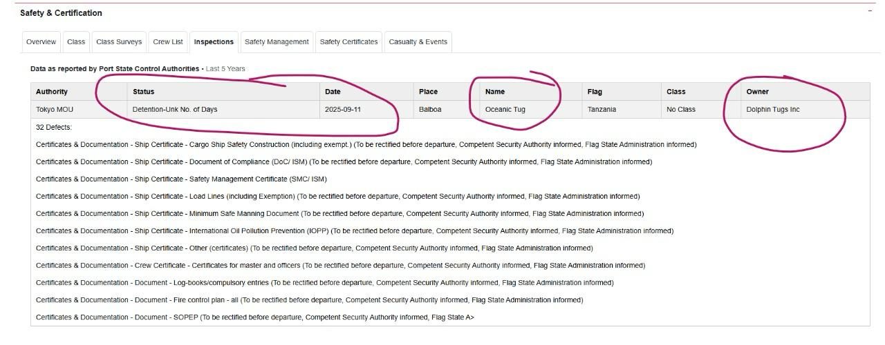 Según Marine Vessel Traffic, esta embarcación está registrada desde 2022 a nombre de la sociedad Dolphin Tugs. Esta sociedad aparece en el Registro Público de Panamá con Torres Chong como su presidente.