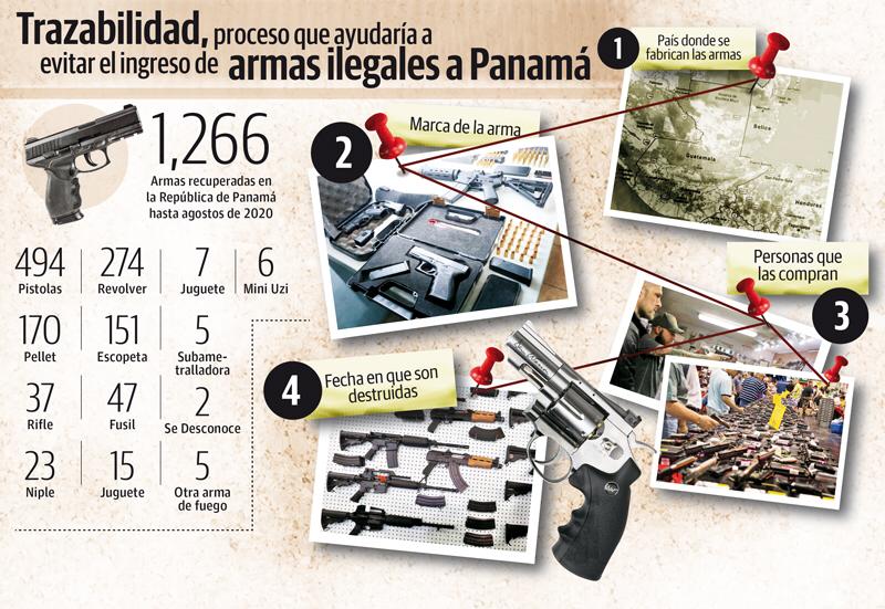 Enfatizó que en Panamá se decomisan aproximadamente 1,500 armas por año, sin embargo, de esa cantidad, no se saca un reporte con los datos estadísticos del armamento, entre ellos: marca, país de fabricación, dónde fue vendida, persona a la que se le decomisó y cuándo fue destruida.