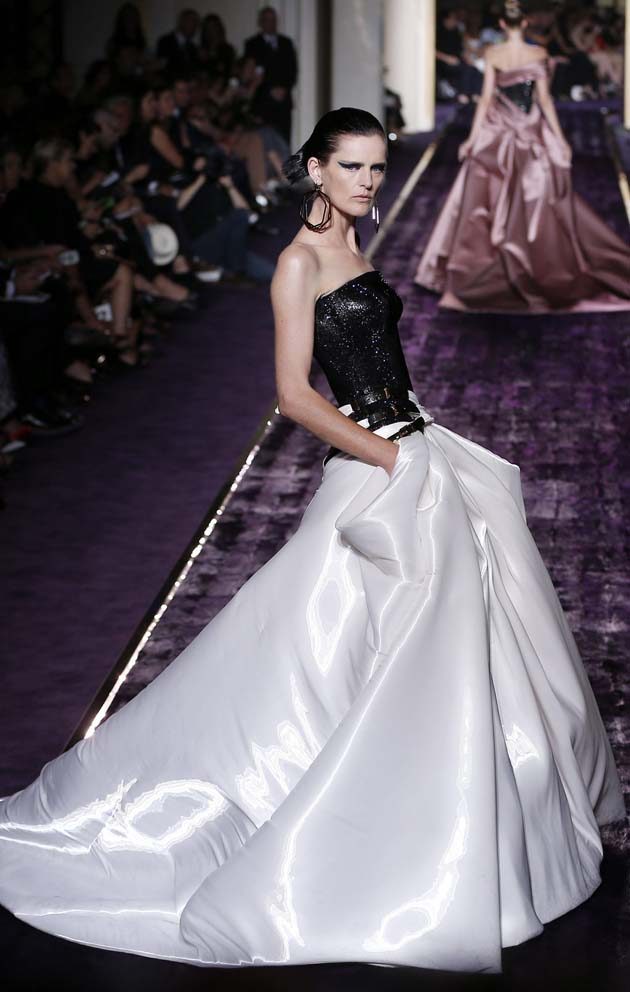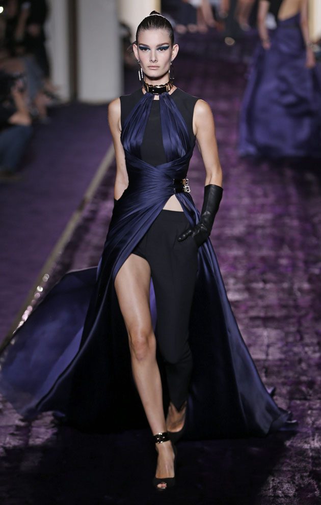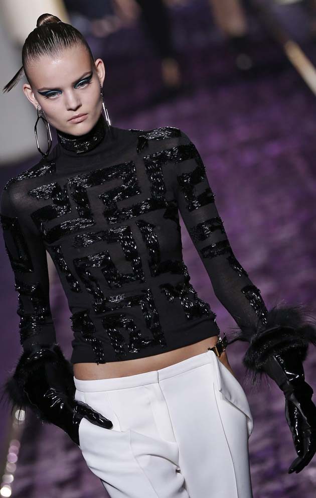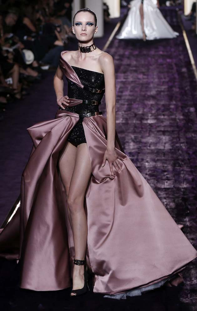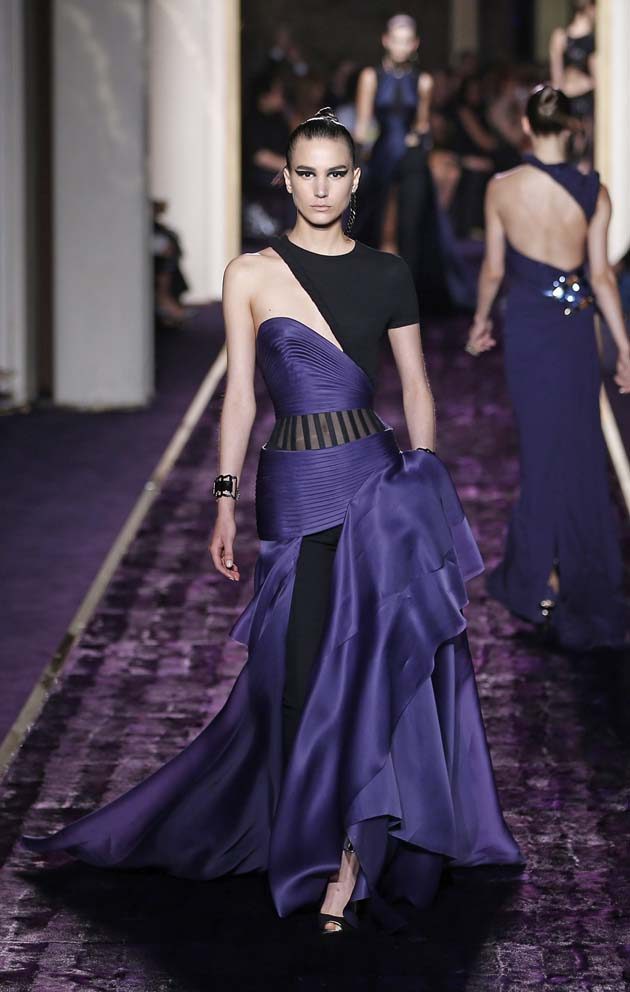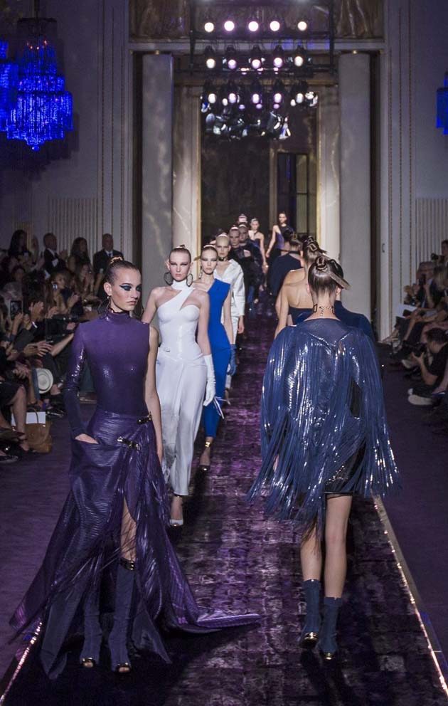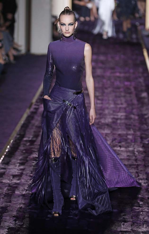La pasarela enmarcado en dorado y de pelo violeta - el color de la antigua realeza que hoy día subconscientemente todavía habla de riqueza - impregna de hasta más extravagancia del estándar de la diseñadora italiana, Donatella Versace.