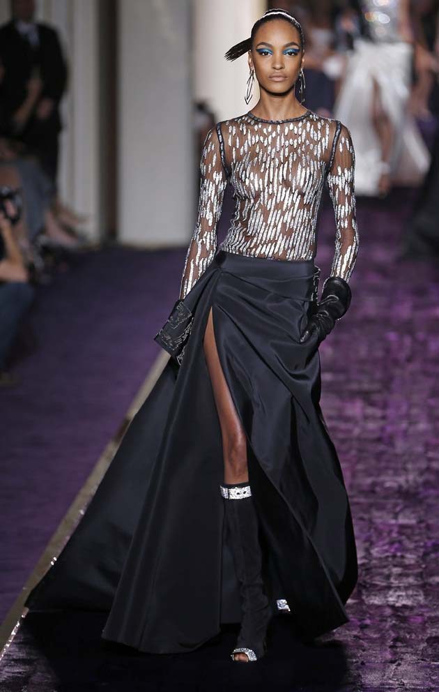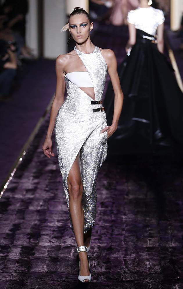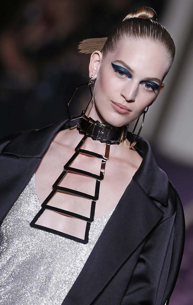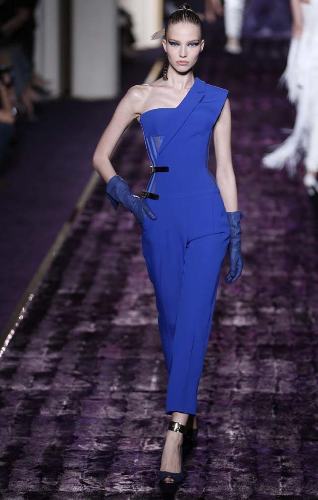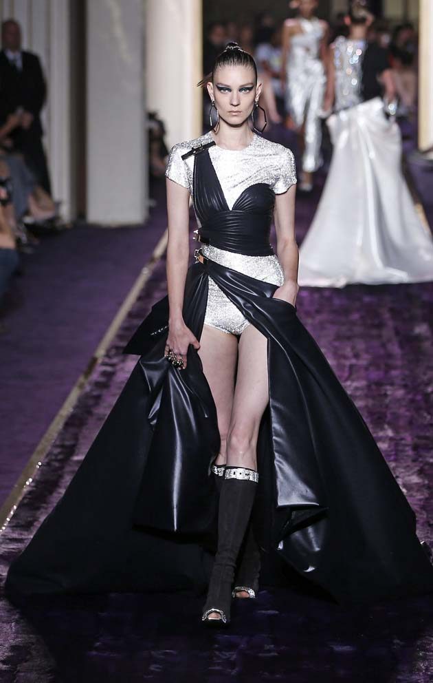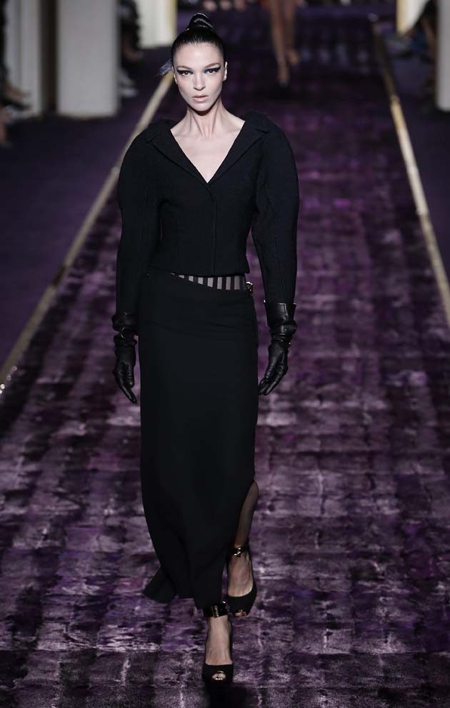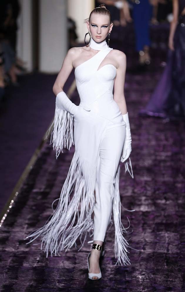 La pasarela enmarcado en dorado y de pelo violeta - el color de la antigua realeza que hoy día subconscientemente todavía habla de riqueza - impregna de hasta más extravagancia del estándar de la diseñadora italiana, Donatella Versace.