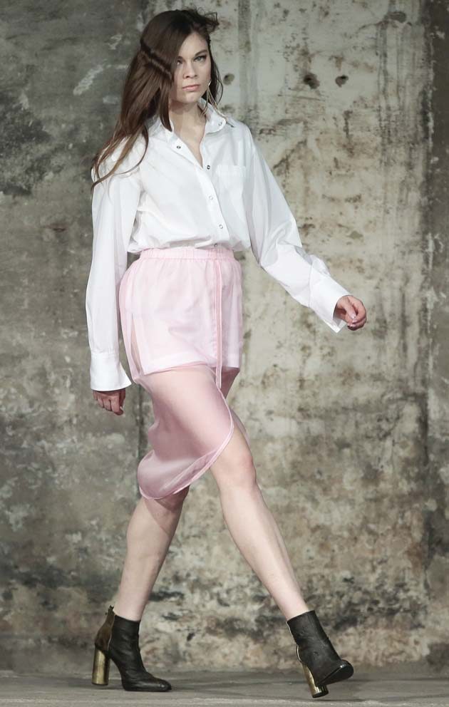 El diseñador Bobby Kolade mezcla la femininidad y la masculinidad dentro de un ámbito europeo desde el Fashion Week de Berlín. La camisa blanca de siempre hace complemento perfecto a la súperfemenina falda rosada y las botas le da el toque urbano.