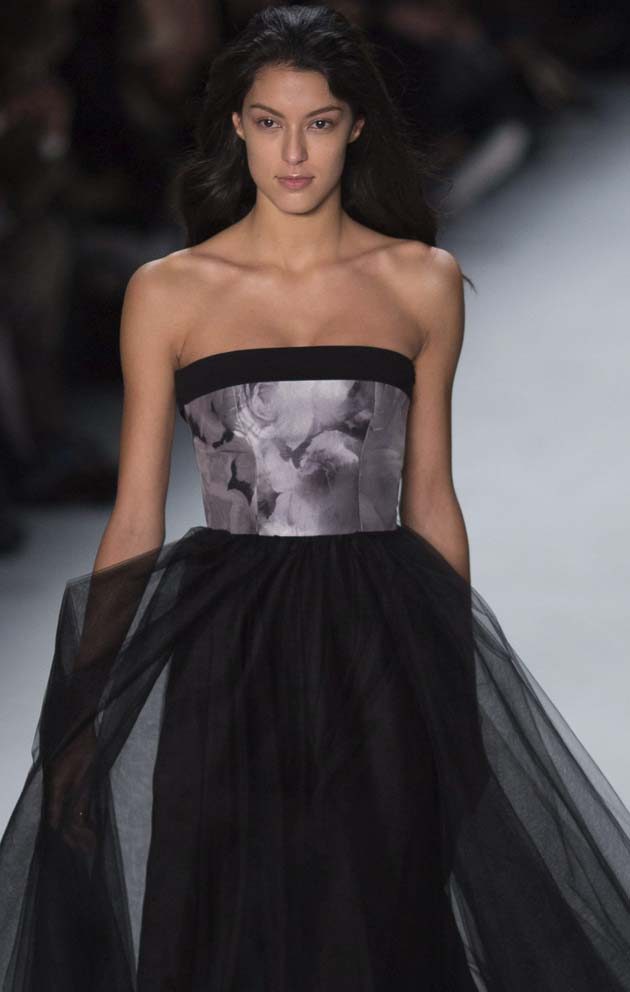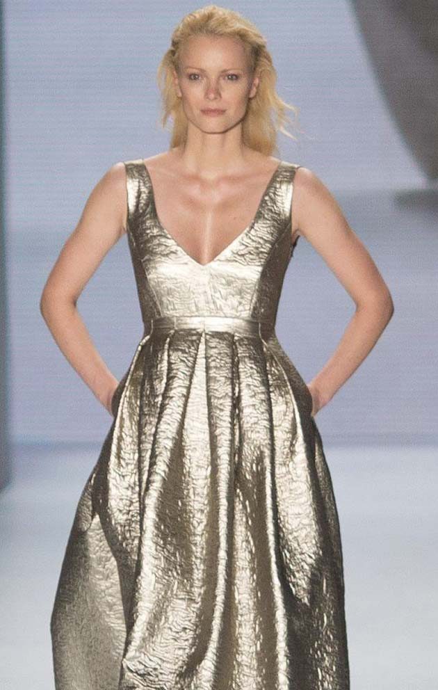 La diseñadora Eva Lutz desata las fantasías de las mujeres con los trajes ajustados arriba, que abren en campana, sin embargo, está consciente de la seriedad de la mujer de hoy y desenvuelve esa fantasía en un estampado de rosas plateadas y negras, y el chiffón de la falda sigue siendo controlable para la comodidad. En otro destaca la misma fantasía en un dorado de diosa griega.