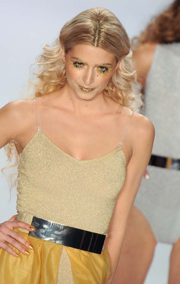 Maybelline hace desfiles para mostrar lo más novedoso en maquillaje, aquí utilizan tonos que resaltan los colores naturales de la modelo, pero con un brillo como si fuera para una fiesta a discoteca. El vestuario, en turno, es segundo al maquillaje, con su cinturón marcando la silueta femina y la camisa dorada sencilla permitiendo lucir el maquillaje primero.