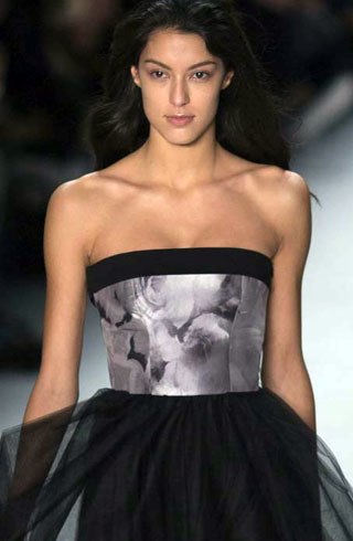 La diseñadora Eva Lutz desata las fantasías de las mujeres con los trajes ajustados arriba, que abren en campana, sin embargo, está consciente de la seriedad de la mujer de hoy y desenvuelve esa fantasía en un estampado de rosas plateadas y negras, y el chiffón de la falda sigue siendo controlable para la comodidad. En otro destaca la misma fantasía en un dorado de diosa griega.