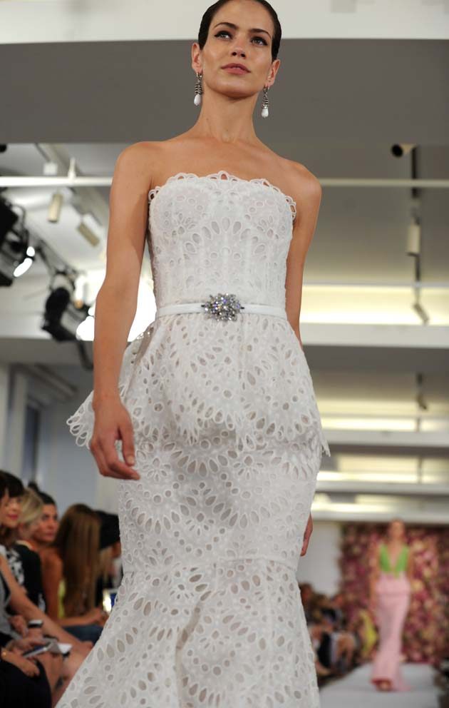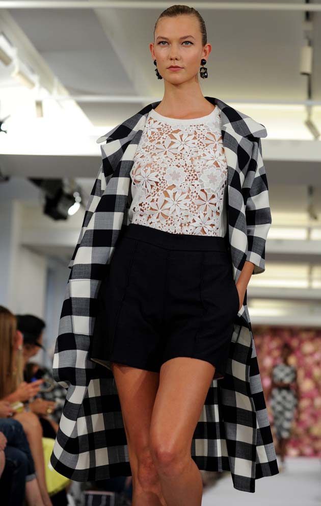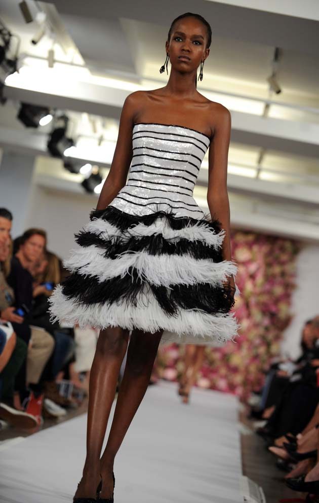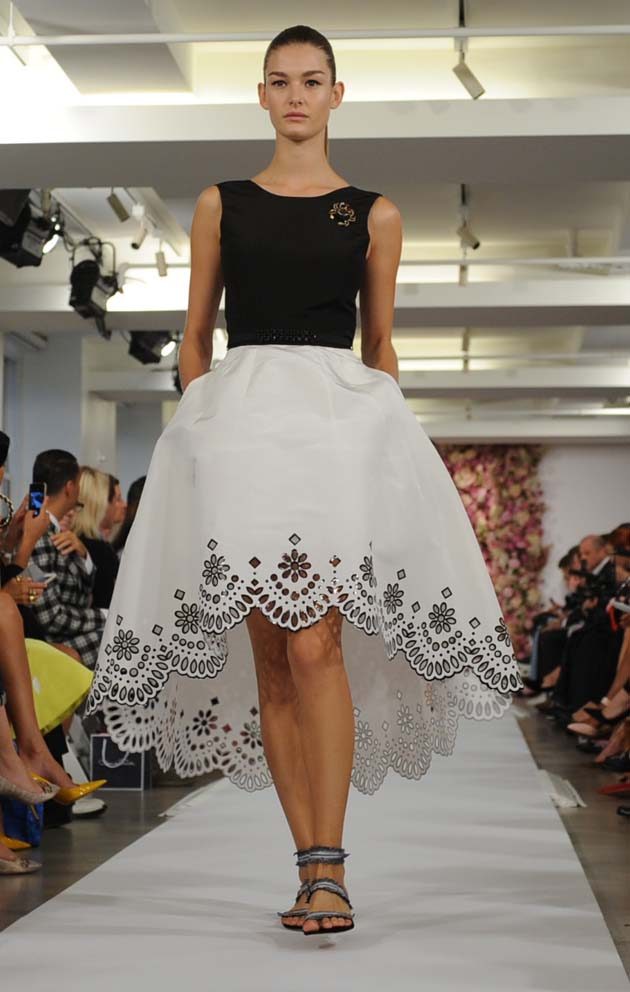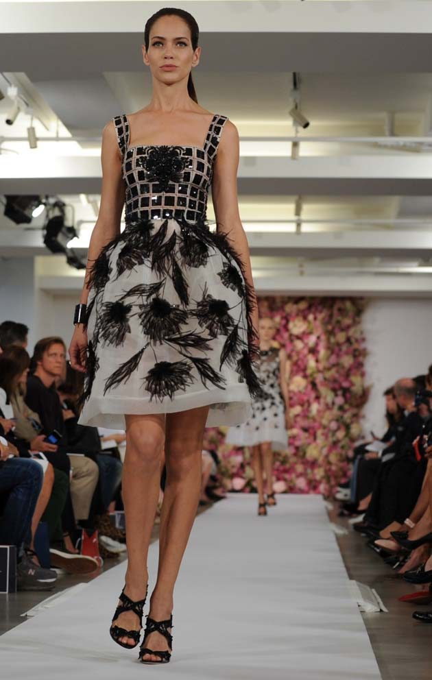 Oscar de la Renta lo pega de nuevo. Con su sentido para lo que le fascina a la mujer en el momento, sigue con sus faldas de campana y colores vivos. Esta temporada reconoce a la tendencia que relució hace un par de temporadas del blanco y negro. Lo más interesante de esta parte de la colección fue un tipo leotardo corto de encaje casi escondido de un abrigo de flores (búscalo en las fotos). Incorporó aquí mucho encaje para suavizar el efecto del contraste tan chocante del blanco y negro.
