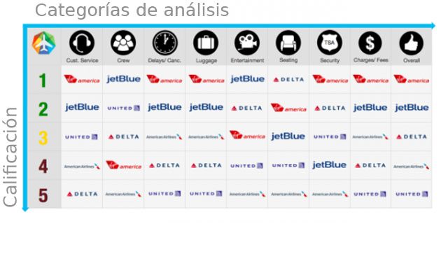 Luminoso monitorea las tendencias de "emociones" por Twitter hacia productos y decidió calificar a Delta, United, American porque dominan el mercado y a Virgin y JetBlue por el "sentimiento de los clientes".