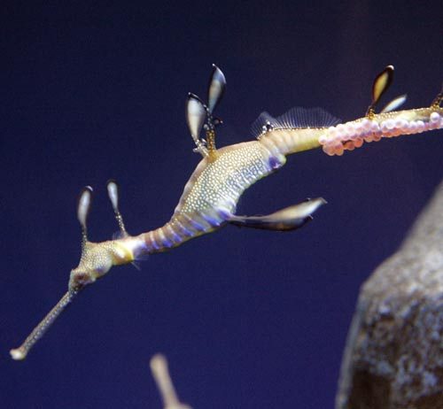 La hembra usa su ovopositor para insertar los huevos maduros dentro de la bolsa incubadora del macho.