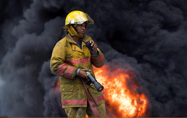 Un bombero solicita ayuda tras quedarse sin agua entre los escombros que dejó una fuerte explosión en una fabrica de plásticos. FOTO/EFE