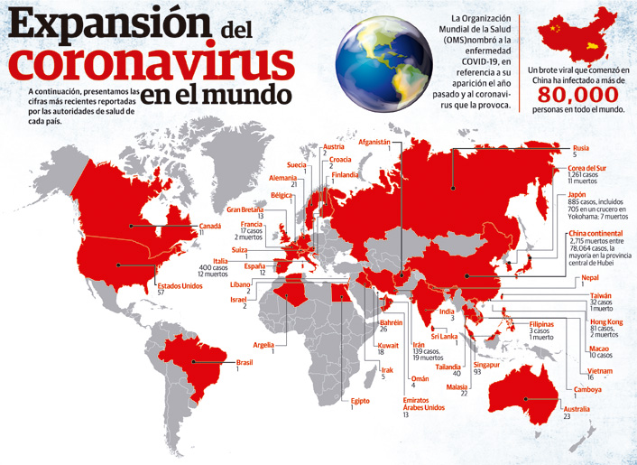 Con la confirmación del primer caso de la enfermedad en Brasil, el mundo está más alerta que nunca, tomando nuevas medidas para protegerse de un mal que ha dejado más de 2,600 muertos y 80 mil infectados en más de 40 países, la mayoría en China, donde se originó.