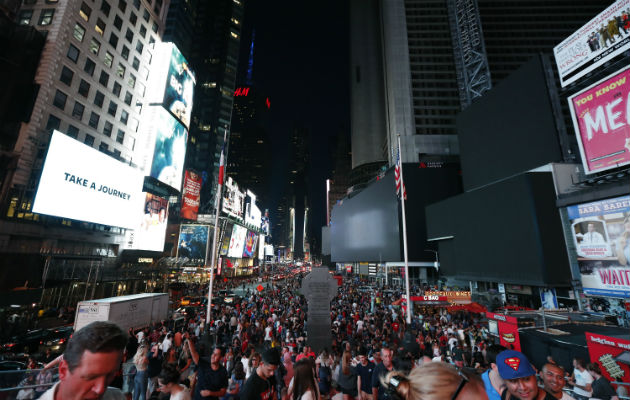 En el aniversario de un apagón en 1977 que dejó sin electricidad a la mayor parte de la Ciudad de Nueva York, un enorme corte de electricidad en una cálida noche de sábado en Manhattan hizo que los espectáculos de Broadway bajaran el telón antes de lo previsto y llenó las calles de gente que empleaba sus celulares como linterna en medio de una cacofonía de bocinas y sirenas del tráfico atascado.