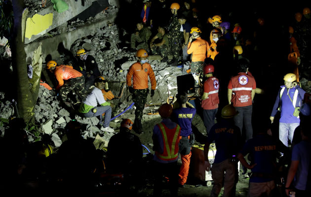 Equipos de rescate trabajan en un edificio derruido tras el terremoto en Pampanga (Filipinas). Foto: EFE.
