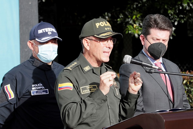 El director de la Policía Nacional de Colombia, general Jorge Luis Vargas (c), habla hoy, durante una conferencia de prensa en la sede la Organización Internacional de Policía Criminal en Bogotá. Foto: EFE
