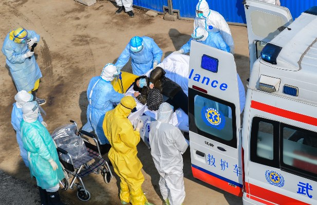 El personal médico transfiere a los pacientes al recién completado Hospital de campo temporal de Huoshenshan en Wuhan, provincia de Hubei, FOTO/AP