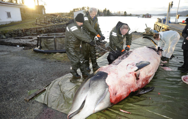 Zoólogos en Noruega hallaron unas 30 bolsas y otros desperdicios de plástico en el estómago de una ballena que quedó varada en una costa del suroeste del país, se informó hoy. Terje Lislevand, de la Universidad Bergen, dijo que el cetáceo de dos toneladas estaba visiblemente enfermo y fue sacrificado. En su intestino "no había alimento, solo restos de la cabeza de un calamar y una delgada capa de grasa". La especialista dijo que la basura no biodegradable fue "probablemente la razón" por la que la ballena encalló varias veces el sábado en aguas someras de las costas de Sottra, en la isla occidental de Bergen, a unos 200 km (120 millas) al noroeste de Oslo. La ONU calcula que cada año se tiran a los océanos 8 toneladas de basura plástica. Por el momento no dio a conocer la edad o el género de la ballena.