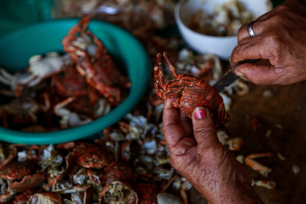 Una persona abre un cangrejo en Recife (Brasil), capital del estado brasileño de Pernambuco, uno de los más afectados por el derrame de petróleo en el Atlántico. FOTO/EFE