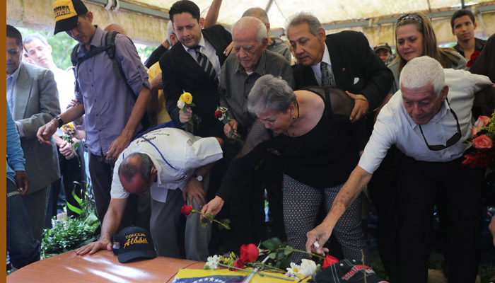 Amparo Salazar, madre del activista opositor Fernando Alban, coloca una rosa en el ataúd envuelto en una bandera que contiene sus restos, durante su funeral en el cementerio del este en Caracas. FOTO/AP