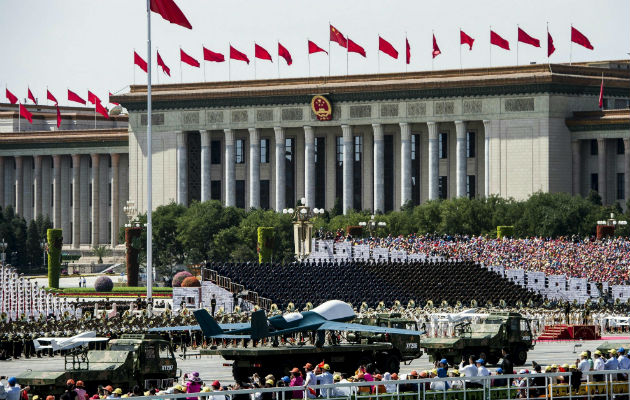 El líder de China presidió un vasto desfile militar con tanques, misiles y soldados que mostró el creciente poder militar del país, mientras aviones de combate zumbaron por encima de su cabeza, al tiempo que anunció una reducción de 300,000 puestos en el ejército para demostrar que el gigante asiático no representa una amenaza expansionista. El gran desfile cruzó el corazón de Beijing para conmemorar la derrota de Japón en la Segunda Guerra Mundial, al tiempo que un escuadrón de helicópteros formó el número 70 en el cielo, pero el acto subrayó también la determinación del presidente Xi Jinping de hacer de China una importante potencia asiática. Xi abrió la jornada con un discurso en la icónica puerta de Tiananmen, en el corazón de la capital china, flanqueado por líderes locales y mandatarios extranjeros, incluyendo el presidente ruso, Vladimir Putin, el surcoreano, Park Geun-hye, y el secretario general de Naciones Unidas, Ban Ki-moon. "La experiencia de la guerra hace que la gente valore aún más la paz'', dijo Xi. "Independientemente de la marcha de los acontecimientos, China nunca buscará la hegemonía, China nunca buscará expandirse y nunca infligirá las tragedias que sufrió en el pasado por otros''. Haciendo hincapié en este punto, Xi anunció que el Ejército de Liberación del Pueblo, que cuenta con 2.3 millones de efectivos, se reducirá en 300,000 puestos hasta los 2 millones de soldados. Aun así seguirá siendo el mayor cuerpo militar permanente del mundo y la medida llega en un momento en que las crecientes capacidades tecnologías de la industria reducen la necesidad de contar con grandes hordas de soldados. Xi pasó revista entonces a las tropas en una limusina de fabricación china, de pie a través de un techo solar con cuatro micrófonos montados ante él y diciendo ``Saludos, camaradas'' a cada tanto antes del inicio del desfile. En el acto participaron más de 12,000 soldados, 500 piezas de armamento militar y 200 aeronaves de varios tipos, representando lo que oficiales militares dicen que es la tecnología más avanzada de las fuerzas armadas de China. El desfile forma parte de las conmemoraciones previstas para reforzar el autoproclamado rol del gobernante Partido Comunista como la fuerza impulsora de la derrota de Japón hace 70 años, además de su papel como salvador de la patria, aunque los historiadores sostienen que sus rivales, los nacionalistas, libraron la mayoría de los combates. Los actos minimizan también el papel Estados Unidos, Gran Bretaña y otros combatientes en la Segunda Guerra Mundial. La mayoría de países democráticos no enviaron a representantes de alto nivel, reflejando su preocupación por el cariz antijaponés del acto y los últimos movimientos agresivos de China con respecto a sus reclamaciones territoriales. El embajador de Estados Unidos participó como espectador. En Washington, el portavoz del Departamento de Defensa, Bill Urban, dijo que la Casa Blanca defiende que este tipo de conmemoraciones deben abordar la reconciliación y que un "gran despliegue militar no parece ser consistente con esta idea''.