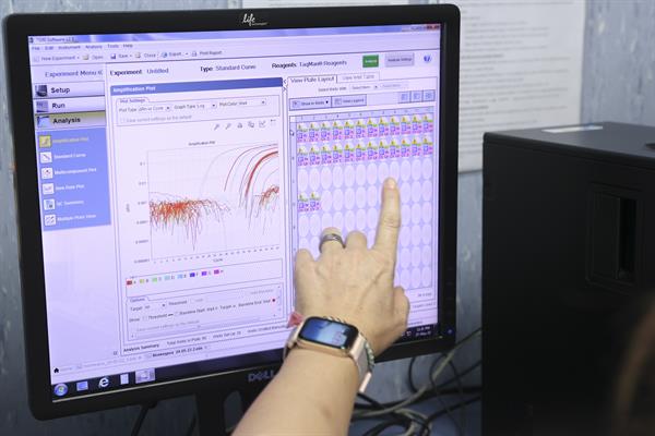 Trabajadores de un laboratorio analiza un muestra de la viruela del mono.