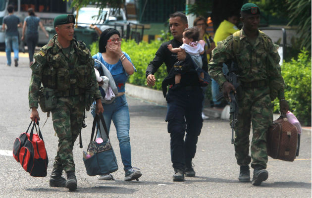 Soldados colombianos acompañan a un policía venezolano (c-d), que carga a su hija, y a su esposa (c-i), luego de desertar, este miércoles en el puente Simón Bolívar, en Cúcuta (Colombia). Foto: EFE.