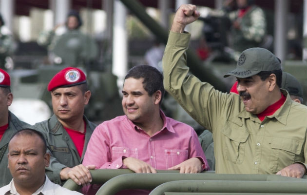 Nicolas Maduro Jr., centro, acompaña a su padre, Nicolás Maduro en una parada militar en Caracas, el 13 de abril de 2018. Foto: AP.