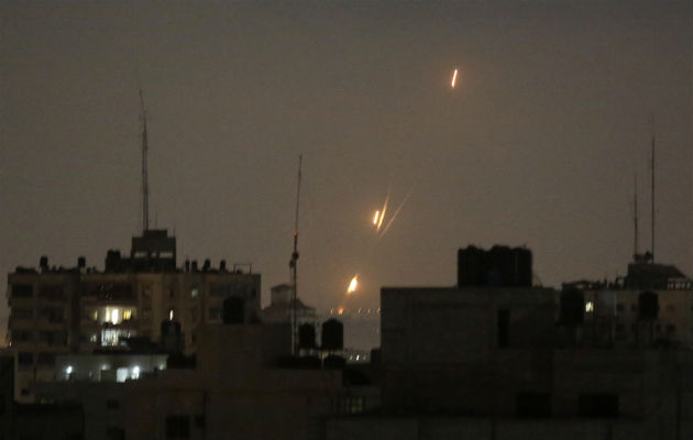 Las llamas de los cohetes disparados por militantes palestinos se ven sobre la Franja de Gaza hacia tierras israelíes. FOTO/AP