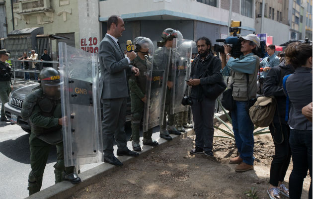 Miembros de la Guardia Nacional Bolivariana impiden el paso de periodistas a la Asamblea Nacional en Caracas. Foto: EFE.