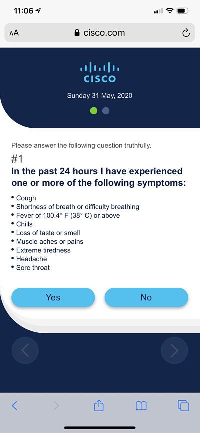 Todos los días, antes de salir rumbo al trabajo, los empleados tendrán que ingresar a una nueva aplicación que diseñó la empresa y responder varias preguntas sobre su salud. En los últimos catorce días, ¿han tenido contacto cercano con alguien que haya dado positivo por COVID-19 o se tenga la sospecha de que está infectado de coronavirus? En las últimas 24 horas, ¿han experimentado escalofríos, dificultad para respirar o pérdida del gusto o el olfato?